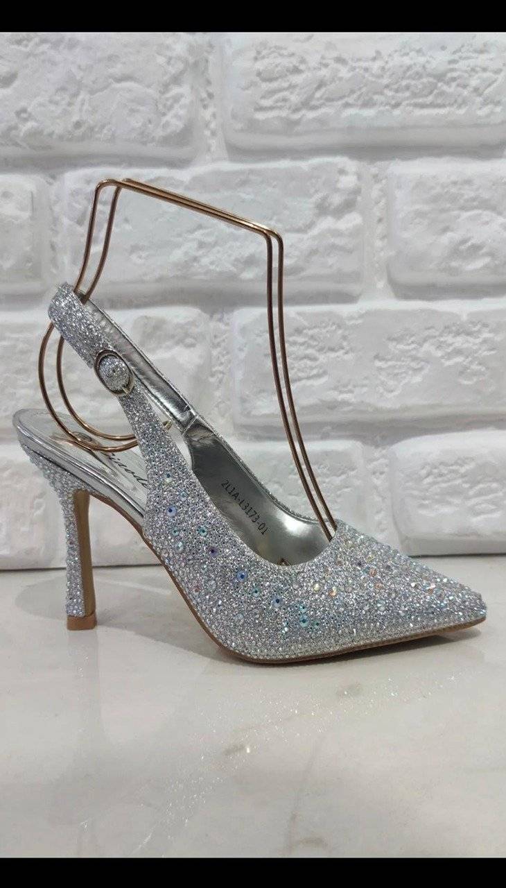 Pantofi Dama, Eleganti, Toc Si Bareta, Strasuri, Argintiu