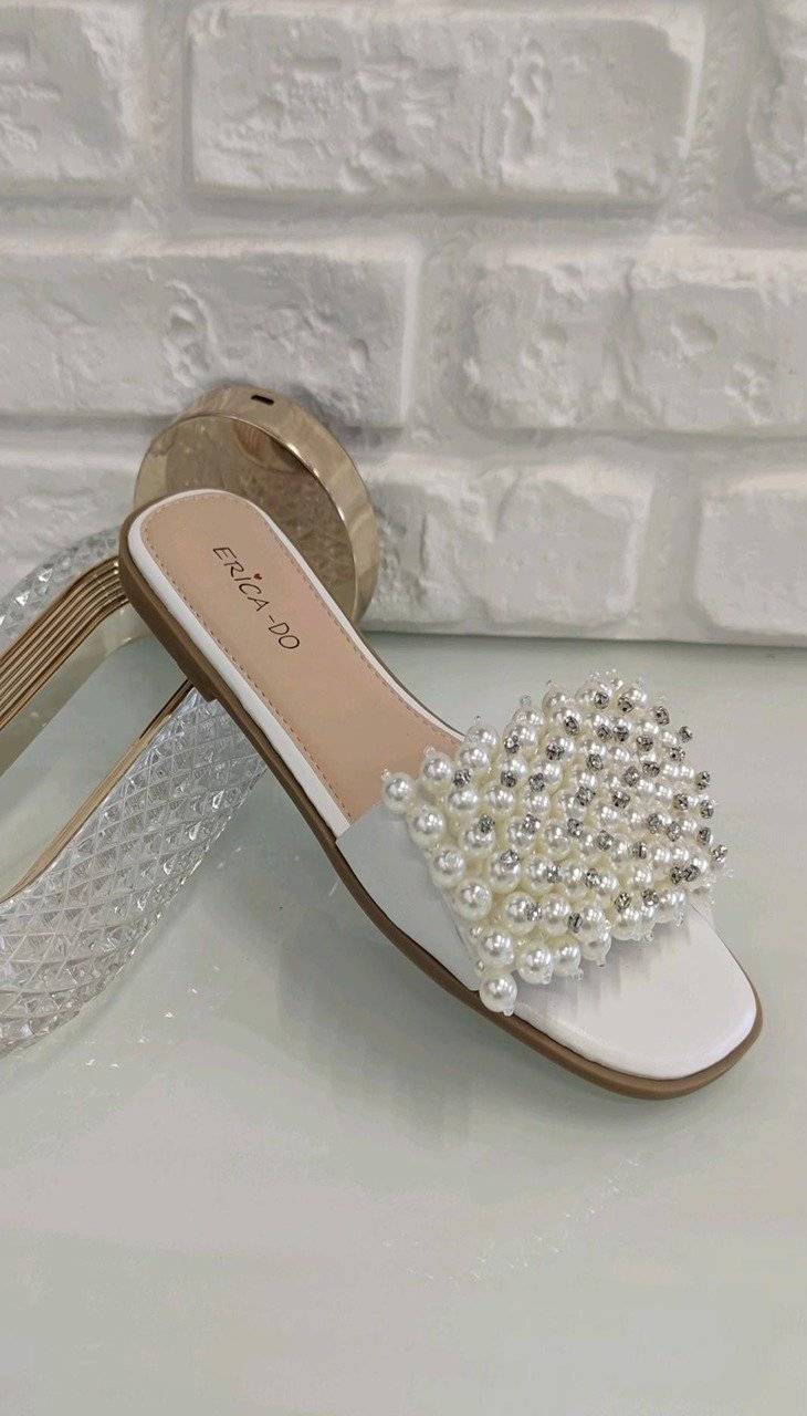 Papuci Dama, Slide, Perle, Alb